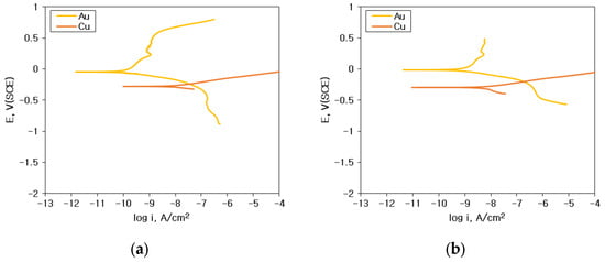 Analysis of galvanic corrosion in Cu wire—Au pad 2nd bond area using the mixed potential theory: (a) 1% NaCl, (b) 1% NaCl + 0.1% HCl.