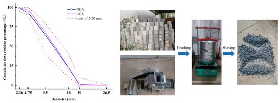 Recycled concrete aggregates were derived from Urumqi’s concrete waste. The research generally agrees that there is less mortar adhered to coarse recycled aggregate than fine recycled aggregate [34,35]. This results in the RCA having a greater quality than the fine fraction of recycled aggregate, and in this sense, it makes sense to improve the quality of a material that is relatively better than a lower-quality material [36]. According to this study, the proportion of aggregate retained between 2.36 and 19 mm sieves is known as the RCA. Table 4 displays the fundamental physical characteristics of the coarse aggregate employed in this investigation. Figure 2 shows the coarse aggregate particle size distributions obtained via sieve analysis.