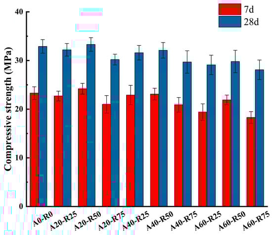 Figure 6 illustrates the impact the impact of the SA and RCA replacement ratios on the compressive strength of ARSCC at 7 and 28 days of curing. In the figure, it can be observed that when the AS is fixed, the compressive strength increases initially before gradually decreasing as the RCA replacement ratio increases. The inflection point occurs at the 50% replacement ratio. Conversely, when RCA is fixed, the compressive strength gradually decreases as the AS replacement ratio increases. Comparing the compressive strength to the control group, A0-R0, there was a maximum increase of 0.4 MPa and a minimum decrease of 4.8 MPa; the highest value was 33.3 MPa for A20-R50, and the minimum value was 28.1 MPa for A60-R75. This suggests that replacing AS and RCA does not significantly affect the compressive strength of hard ARSCC, given that replacing SA with an appropriate ratio and NCA with a similar RCA content optimizes the gradation of concrete aggregates and increases compactness.