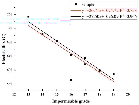 Figure 7 illustrates the relationship between the electric flux and the impermeability grade. After linear fitting, it was discovered that there is a distinct linear association (R2 = 0.758); if the A60-R25 sample is removed, R2 = 0.996 is achieved. The 6 h electric flux of ARSCC exhibits a declining trend as the impermeability grade rises. As a result, water finds it more difficult to pass through ARSCC at certain pressures, which is also indicative of the material’s increasing compactness, decreasing internal pore space, and steadily declining total permeability. Chloride ions also find it challenging to pass through ARSCC. As the impermeability grade rises, the electric flux tends to decrease. The ideal relationship between concrete’s electric flux and impermeability grade would be a strong linear one. However, because ARSCC is a non-homogeneous material, interference from multiple factors might affect its own state. Additionally, there will be varying degrees of impact on the concrete’s exterior morphology and interior structure in the specimen used for molding, curing, vibration, grinding, and other tests. As a result, ARSCC’s attributes cannot be fully represented in a linear relationship during the fitting process.