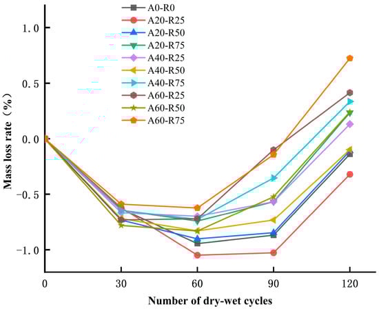 The mass loss has been measured in the range of −1.048% to 0.724% for ARSCC mixtures. As seen in Figure 9, in order to highlight the damage, these results are discussed in terms of the mass loss caused to the ARSCC mixtures following exposure to sulfate attacks. As the number of dry–wet cycles increased, the mass loss first reduced and then increased. For instance, the mass loss of the A20-R25 specimen was approximately −1.05% to −0.32%, while the A20-R50 specimen had a strength loss of −0.90% to −0.11%. Compared to combinations comprising other replacement ratios, low replacement ratios of AS and RCA demonstrated a significantly superior resistance to sulfate assault. Furthermore, these findings show that, in comparison to A0-R0 (control), appropriate replacement ratios of AS and RCA result in less mass loss.