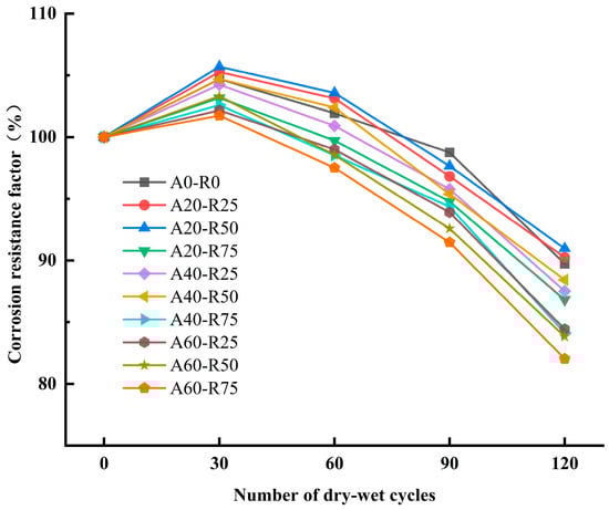 The compressive strengths of A20-R50 and A20-R25 declined by 4.9 MPa and 3.1 MPa after 30 to 120 cycles, respectively, compared with their strengths after 30 cycles. The compressive strength of A0-R0 decreased by 4.9 MPa. The findings of the ARSCC’s corrosion resistance factors are displayed in Figure 11. When comparing the corrosion resistance of ARSCC to its compressive strength, the corrosion resistance factor can provide a more accurate picture.