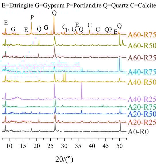 The XRD patterns for samples of every mixture following the sulfate attack are seen in Figure 13. The samples of the mixtures A0-R0 and A20-R50 following 120 dry–wet cycles have noticeable ettringite peaks and less intense peaks for Ca(OH)2 when compared to samples with varying replacement ratios. Meanwhile, there are clear Ca(OH)2 peaks in the A60-R75 sample following 120 dry–wet cycles. Ettringite production is accelerated by corrosion time. As per the earlier research, the process of concrete corrosion due to sulfate attacks can be explained as follows: in the pore solution, the dissolved hydrated calcium hydroxide is devoured by the sulfate ions in the chemical reaction, leading to the creation of gypsum [44,45]. Then, as a result of the cement’s hydration, mono-sulfoaluminate (AFm) or ettringite (Aft) may further form in the micropores. However, AFm may also react with gypsum and pass through into the more stable phase of ettringite, as demonstrated by the chemical reaction represented by Equations (4)–(6) [43]. It is discovered that a high AS and RCA replacement ratio creates more room for products to form and makes it easier for SCC to disrupt the pore structure, which results in the appearance of more severe ettringite peaks [46]. The findings of the mass change and relative dynamic elastic modulus variation in Section 3.3.2 and Section 3.3.3 are supported by the XRD pattern results.