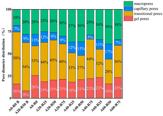As illustrated in Figure 14 and Figure 15, MIP tests were performed on samples of the A0-R0 and A20-R50 mixtures prior to the sulfate assault, on A0-R0B and A20-R50B, and on all mixtures following the sulfate attack. The prior work identified four main categories for concrete pores: macropores (width > 1000 nm), capillary holes (diameter 100–1000 nm), gel pores (diameter < 10 nm), and transitional pores (diameter 10–100 nm) [47,48]. In general, it is believed that gel holes may have a significant impact on the durability of concrete; pores bigger than 10 μm may have an impact on the compressive strength of concrete [47]. When the pore distributions of A0-R0B and A20-R50B were compared, it was discovered that A20-R50 had more gel pores and macropores prior to sulfate assault. Following a sulfate assault, the pore distribution of A20-R50 and A20-R25 is comparable to that of A0-R0, but there are fewer gel pores and macropores. This indicates that the corrosion resistance of ARSCC is caused by a proportionate decrease in gel pores and macropores. The mass change and relative dynamic elastic modulus variation results in Section 3.3.2 and Section 3.3.3 are supported by the MIP results.