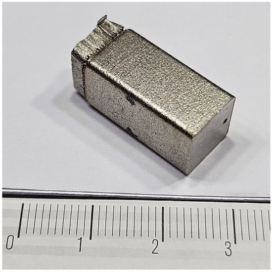 Figure 1 shows a typical IN718 sample manufactured using powder bed fusion (PBF) technology with an EOSINT M280 3D printer (manufactured by EOS GmbH, Krailling, Germany) in an inert atmosphere (Argon). The printing parameters were optimized to produce samples 10 mm × 10 mm × 10 mm in size with a layer thickness of 0.040 mm, a hatch distance of 0.110 mm, a scan speed of 960 mm/s, a laser power of 285 W, and a 67° layer rotation. The chemical composition of the powder was analyzed using a Varian SpectrAA 220 Atomic Absorption Spectrometer (from Varian, Alto Palo, CA, USA). The measured composition of the powder was as follows: Ni (50.28%), Fe (Balance), Cr (18.27%), Nb (7.27%), Mo (3.48%), Ti (1.1%), Al (0.45%), and C (0.08%). Thermo-Calc® software (https://thermocalc.com (accessed on 13 November 2023), Stockholm, Sweden) version 2019.1, which uses the CALPHAD method, was utilized to predict the phase equilibria in multi-component systems. The Thermo-Calc Nickel-based superalloys databases (TCNI8, MOBNI4) were used to calculate phase fractions, Scheil–Gulliver solidification, and diagrams in temperatures ranging from 300 to 1400 °C. The simulation parameters for AM-manufactured goods, such as dislocation density alloys or the wetting angle, were adopted from the literature [14,15]. Experimental data on morphology and microstructure used in the simulations were obtained from our previous investigation on IN718 [13].