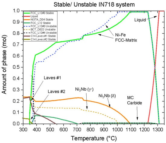 Prediction of phase amounts in the IN718 system for the investigated chemical composition. The graph showcases stable phases (solid lines) and metastable phases (dashed lines).