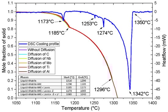 According to Rayner et al. [18], there is a relationship between DSC temperature peaks and phase transformations. In AM, the thermal characteristics of phase diagrams where there are non-equilibrium thermodynamic conditions cause the formation of metastable phases. Thus, the Scheil–Gulliver solidification model provides an accurate transition temperature of the material, determining heat signals associated with the formation of phases [19].