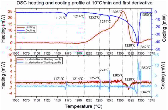 The metallographic preparation of the as-built bulk material was carried out. First, 50 mg of material was obtained using a cutting disk from Buehler (Lake Bluff, IL, USA). Then, this sample was subjected to thermal analysis using a SETSYS Evolution DTA/DSC instrument (Setaram Instrumentation, Caluire-et-Cuire, Francia) according to ASTM D3418 [16] to measure thermal behavior from 25 °C to 1400 °C. The sample was heated at a rate of 10 °C/min and was soaked for 5 min at 1400 °C to homogenize it; then, it was cooled at the same rate.