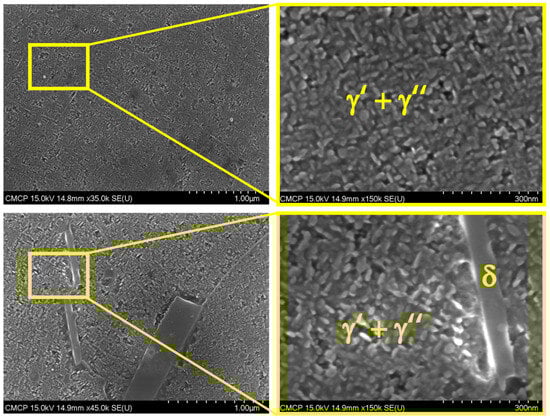 As a result, precipitation, solidification, and reinforcing phase growth mechanisms can exhibit notable differences compared to traditional manufacturing methods. In their study, Sanchez et al. [10] show a comprehensive summary of the factors impacting the functional performance of nickel-based superalloys specifically manufactured using additive processes. Morphological defects and microstructures are present and differ from those obtained using conventional manufacturing techniques. Moreover, microstructural characteristics and mechanisms such as phase precipitation, textures, and grain sizes vary from reported thermodynamic predictions. Gallmeyer et al. [11] report that, during the formation of parts obtained via AM, the precipitation of the δ phase is detrimental and undesirable during the nucleation process of reinforcing phases such as γ’ and γ′′. Naiyuan Xi et al. [12] established that the configurations of the δ phase have a significant effect on the plastic deformation of grains, where the large δ phase at the grain boundary limits the intergranular deformation significantly, but the large intragranular δ phase may cause strain localization and then lead to rapid failure. In summary, the kind, morphology, and location of the phases in the AM process make it difficult to understand the solidification process of the reinforcing phases and, consequently, its impact on mechanical properties.