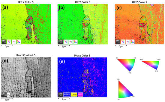 EBSD inverse pole figure (IPF) in three axes (a) x, (b) y, (c) z. (d) SEM image, and (e) phase distribution of γ′′, Laves, and NbC carbides obtained at 20 Kv and tilt 70°.