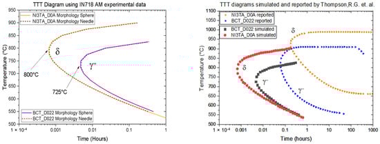 (Left) δ and γ′′ TTT diagram of IN718 obtained via AM according to morphology shape (sphere and needle) when nucleating in bulk. (Right) Comparison between our simulated TTT diagram of IN718 and others referenced [34].