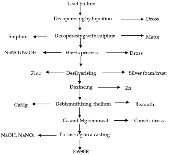 Lead is mainly extracted by pyrometallurgical processing of primary sulphide ore [2,8,9]. Pyrometallurgical methods involve recovering materials (especially metals) at sufficiently high temperatures by transferring them to specific condensed phases (including metallic alloys) or the gas phase with subsequent condensation. Pyrometallurgical methods are chemical processes that take place due to the heat from burned fuel or other exothermic reactions. Obtaining metals from these methods is based on the reduction of metal oxides, most often using carbon (C) or carbon monoxide (CO) [8,9].