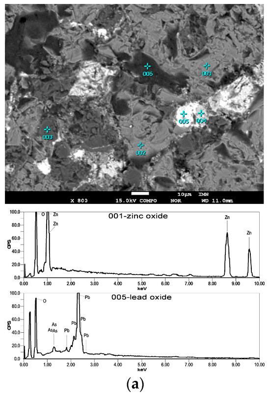 Examples of microareas of Pb refining slag samples [19]: (a) example of an image of the investigated microareas: 001- and 002-wüstite and zinc oxide in glass, 003-willemite, 004-alamosite, 005-lead oxide, 006-quartz [19]; (b) example of an image of the investigated microareas: 001-Na2Zn (Si2O6) with impurities of wüstite, 002-wüstite, 003-alloy type Pb27Fe24Zn10Cu10O16C7Rs7 [19]; (c) example of an image of the investigated microareas: 001- and 002-kirschteinite with Na2Zn(Si2O6) and carnegieite with admixtures of sphalerite, 003-Ag met [19].