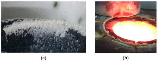In this process, the furnace charge consists of refining slags, coal (reducing agent), and limestone CaCO3 (flux). During the processing of the slags, sample weight loss was observed, which primarily occurred due to zinc evaporation caused by the reduction process. This zinc then is oxidised and accumulates on the filter in the form of ZnO (Figure 6a) [19]. In addition to the zinc oxidation reaction, the observed change in the sample weight in this method may result from various other factors, including the reduction of lead oxide, the combustion of coal and sulphur, or the addition of limestone or iron. The lead yield in this process is higher than 75%. It is difficult to determine the efficiency of zinc recovery from slags because during their processing, Zn is oxidised, and the resulting ZnO accumulates not only on the filter but also in the furnace chamber (Figure 6b) [19]. This ZnO would require further leaching with a sulphuric (VI) acid solution to obtain Zn.