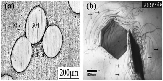 Uhríčik et al. [20] found that the temperature damping of magnesium alloys can be divided into temperature-independent and temperature-dependent regions. Among them, the temperature-dependent region is characterized by a maximum damping value and the exponential growth of damping performance at higher temperatures. The reason for this phenomenon is continuous precipitation. The finer and more numerous the precipitates, the more obstacles there are to dislocation movement, and the damping value reaches a maximum value. Zhang et al. [21] studied the influence of different heat treatment processes on the damping properties of AZ91D alloys and found that the G-L dislocation theory can explain these phenomena well. Solution strengthening makes the second phase in the alloy dissolve. According to the G-L dislocation theory, the movement of dislocations is less restricted, and the damping performance of the alloy is improved. The aging process promotes the precipitation of the Mg17Al12 phase, making dislocation more difficult to move. So, the alloy’s damping performance is reduced. Mart’ınez. et al. [22] found that the damping properties of AZ31, AZ61 and AZ91 alloys decreased with increased Al content. The addition of the Al element undoubtedly firmly pins dislocations, which reduces damping performance. Wan et al. [23] found that G-L dislocation theory can significantly explain the strain-amplitude-dependent damping spectrum under a low or moderate strain amplitude. Microplastic deformation occurs under high strain amplitude, but the deformation is still predominated by the movement of dislocations. Parande et al. [24] added eggshell particles to a Mg-Zn matrix and found a mismatch of them, leading to the multiplication of dislocations. Damping properties were improved because of the higher density of dislocation. Li et al. [25] found a novel microstructure, shown in Figure 2a, by mixing 304 stainless steel wire with Mg (304/Mg). The high density of dislocations around the 304 stainless steel wire could be an energy dissipation source, which led to a higher damping capacity of 304/Mg.