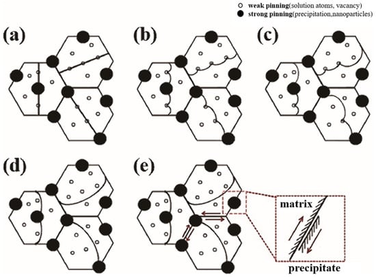 Schematic illustration of the temperature-dependent damping mechanism for the CEC-processed 1%SiCnp/AZ91D composite: (a) unloaded, (b) low-temperature zone, (c) intermediate-temperature zone I, (d) intermediate-temperature zone II and (e) high-temperature zone [29].