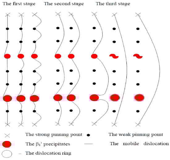 Zhou et al. [32] proposed an improved G-L model. After aging treatment, a ZK60 alloy showed higher strain-amplitude-dependent damping performance. This phenomenon was related to dislocation movement in the G.P.I zone. In the high-stress stage, dislocations bow out between strong pinning points and dissipate more energy by sweeping the G.P.I zone region. Similar results were also found in the research of Zhou’s group [33]. They also found that the β1′ phase (MgZn2) in ZK60 can improve magnesium alloys’ mechanical and damping properties. The mechanism is shown in Figure 4. Dislocation sweeps the β1′ phase to dissipate extra energy, showing an increase in the magnesium alloy’s damping performance.