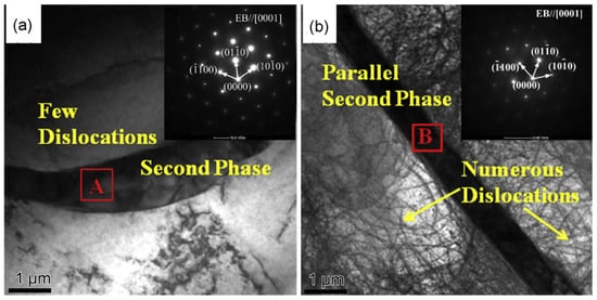 Lu et al. [55] found that different processes in Mg-Zn-Y-based alloys could obtain long-period stacked ordered phases. After heat treatment, obtaining a layered second phase in samples with fewer solid solution atoms in the matrix was more difficult. Moreover, the layered second phase significantly affects the damping properties of magnesium alloys. A sparse second phase can improve the damping properties without substantially reducing the mechanical properties of magnesium alloys. The reason may be that too-compact LPSO phases can hinder the dislocation motion in the matrix. The effects of different Ce contents on the microstructure and damping properties of a Mg-Ce binary alloy were studied by Wu et al. [56]. They found that Mg-2Ce’s damping performance is excellent in strain-amplitude- and temperature-dependent regions. A large number of parallel second phases were found in it, as shown in Figure 5. There are many parallel and uniform dislocations around this second phase, significantly improving the damping performance of magnesium alloys.
