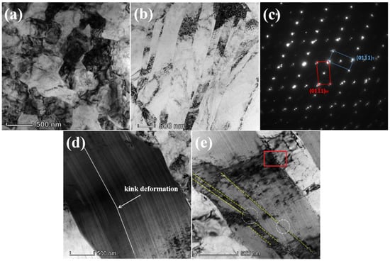TEM images of the cold-rolled alloy after heat treatment: (a) bright-field image of the nano-grains; (b) bright-field image of the 1011 deformation twin; (c) SAED pattern from the twin boundary region in (b); (d) bright-field image of the 18R LPSO phase with kink; (e) bright-field image of the deformation twin in the 18R LPSO phase (the twin boundaries and a large number of dislocation regions are marked with dotted circles and red rectangles, respectively) [62].