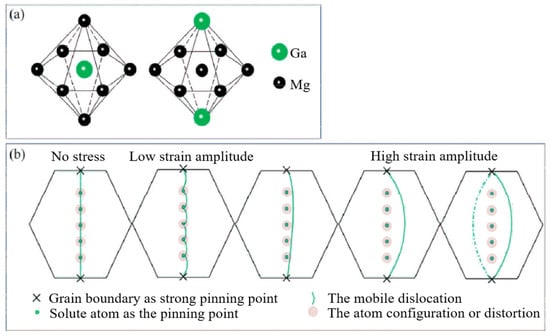 Srikanth et al. [76] added Cu to AZ91 and found that the damping performance of a magnesium alloy increased with an increase in Cu content in a particular range. This phenomenon occurs because adding the Cu element increases the dislocation density and the range of the plastic deformation zone. The effect of the Y element on a ZK60 magnesium alloy was studied by Wang et al. [23]. They found that when the mass fraction of Y element as 2.5%, the magnesium alloy’s damping performance and mechanical properties could reach a reasonable level. This phenomenon is attributed to the formation of a new phase, Mg3Y2Zn3. On the one hand, Mg3Y2Zn3 purifies the magnesium matrix and reduces dislocation pinning when it is formed; on the other hand, the thermal expansion coefficients of Mg3Y2Zn3 and the magnesium matrix are pretty different, which leads to an increase in dislocation density. Huang et al. [77] analyzed the solid solution strengthening and damping properties of a Mg-Ga binary alloy. They found that adding Ga not only improved the mechanical properties of the magnesium alloy, but also optimized the damping properties of the magnesium alloy. Regarding the experimental results, the authors put forward an improved G-L dislocation model, as shown in Figure 7. Because of the great difference between the radii of the Ga atom and Mg atom, there are many lattice distortions and modulus mismatches the crystal. Dislocation will dissipate extra energy when interacting with them in motion, increasing damping performance.