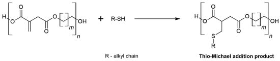 - Farmer, T.J.; Macquarrie, D.J.; Comerford, J.W.; Pellis, A.; Clark, J.H. Insights into Post-Polymerisation Modification of Bio-Based Unsaturated Itaconate and Fumarate Polyesters via Aza-Michael Addition: Understanding the Effects of C=C Isomerisation. J. Polym. Sci. Part A Polym. Chem. 2018, 56, 1935–1945. [Google Scholar] [CrossRef] [PubMed]