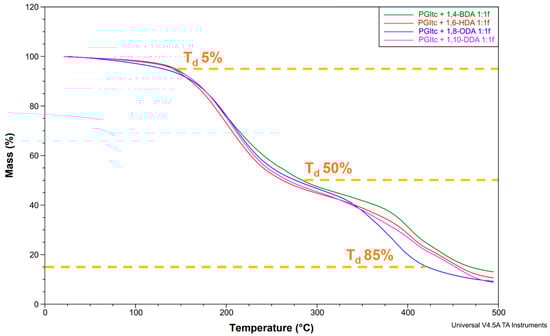 - Jacob, P.L.; Ruiz Cantu, L.A.; Pearce, A.K.; He, Y.; Lentz, J.C.; Moore, J.C.; Machado, F.; Rivers, G.; Apebende, E.; Fernandez, M.R.; et al. Poly (Glycerol Adipate) (PGA) Backbone Modifications with a Library of Functional Diols: Chemical and Physical Effects. Polymer 2021, 228, 123912. [Google Scholar] [CrossRef]