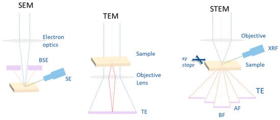 Main features of different electron microscopy setups. In SEM, the electron beam is focused on the sample, the image is reconstructed from secondary (SEs) and backscattered electrons (BSEs). In TEM, the sample is illuminated by a parallel electron beam, and the 2D image (transmitted electron (TE)) is formed on the detector. In STEM, the electron beam is focused on the sample, and transmitted electrons are visualized on the detectors. BF: bright field; AF: annular dark field. The X-ray fluorescence (XRF) allows for chemical maps.