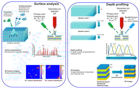 Mass spectrometry is an analytical technique that uses a mass spectrometer to separate ions by their mass-to-charge ratio. It is a powerful yet (micro-)destructive tool that provides information about a given sample from both its surface (with an overall sensitivity of parts per million (ppm)) and bulk (with a sensitivity of part per billion (ppb)) in comparison to EDS, AES (Auger electron spectroscopy) and XPS [130]. It provides a detailed analysis of a thin film’s chemical composition, as well as interfacial characterization, and yields information about the elemental distribution in the range of a few monolayers (1–3 monolayers) through depth profiling. Furthermore, by using advanced liquid-metal ion guns (LMIGs), one can reach a lateral resolution of about 100 nm for elemental detection (ToF-SIMS imaging). The average lateral resolution obtained is <50 nm with a depth resolution of <10 nm [67,69,131,132,133,134,135,136,137]. For thin films, static ToF-SIMS is helpful to detect any kind of inhomogeneity and defects on the surface as it provides chemical maps with high sensitivity, high mass resolution (M/ΔM 10,000) and a high lateral resolution. The depth profiling can provide information regarding anomalies in the thin-film layers and the interfaces. A three-dimensional image of the composition of film is also achieved, showing the possibilities of any diffusion across the interfaces (see Figure 2).