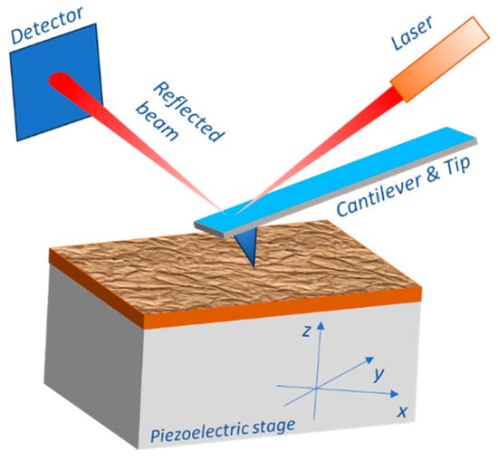 Atomic force microscopy (AFM) has become an indispensable tool for the characterization and development of thin-film materials and devices, allowing for the wide probing of several surfaces and interfaces properties with nanoscale resolution. In AFM, a sharp tip on the end of a flexible cantilever scans across the sample surface while deflections of the cantilever are measured (Figure 3). These deflections correspond to tip-sample interaction forces that allow for the generation of topological images of the sample surface. AFM is ideally suited for characterizing thin films and buried interfaces as it can probe nanoscale morphology, surface roughness, friction, magnetism, electrical properties, and more [157,158,159,160]. Operating modes such as contact, tapping, and non-contact AFM allow for the optimized imaging of delicate samples. Key strengths include the ability to map topological and material variations with nanometer resolution, measure extremely weak forces, and conduct the in situ imaging of samples during processing. Advanced AFM techniques can provide compositional mapping, phase contrast, electronic structure, and even sub-molecular resolution on suitable samples. Specific applications of AFM on thin magnetic films are detailed in Table 3.