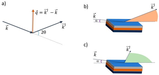where is the periodicity vector, is the scattering vector, and are the incoming and diffracted beam wavevectors (Figure 4), and representing elastic scattering. Equation (1) shows that diffraction probes periodic structures that are parallel to the scattering vector. Because , Equation (1) is equivalent to the well-known Bragg equation: . Wide-angle (or high q) methods are used to provide crystallographic information in terms of unit cell symmetry and structure (average atomic positions in the unit cell). XRD is a well-known, laboratory available, non-destructive technique used primarily for the phase identification of crystal structures in bulk materials. Analysis of the diffractograms provides quantitative details such as particle size, strain, the degree of ordering, texturing and superstructures. Low-angle (or low q) methods are used to probe longer periodicities such as multilayers and superstructures. The role of X-ray diffraction in the characterization of thin epitaxial films, multilayers and superlattices have been reviewed in various studies [174,175].