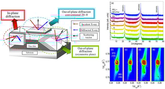 (Left) A schematic diagram of the geometries of thin-film high-resolution X-ray diffraction measurement, showing relations between the lattice planes of a thin-film sample and X-ray geometries. Adapted from Ref. [190]. (Right) High-quality heteroepitaxial SrRuO3 thin films with varying P(O2). (a) XRD θ-2θ scans for epitaxial of SrRuO3 shifts to a lower angle, indicating an increase in the c-axis lattice constant. XRD reciprocal space mapping of the SrRuO3 thin film grown at P(O2) = (b) 300, (c) 100, (d) 30, and (e) 1 mTorr around the (103) Bragg reflection of the SrTiO3 substrate, which shows a coherently strained film with the same in-plane lattice constant, respectively. Adapted from Ref. [191].