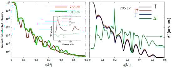 The ability to tune the X-ray beam close to the atomic absorption edge available at synchrotron radiation facilities adds the possibility of exploiting the resonance effect for XRR (R-XRR) as well, adding a valuable degree of freedom useful to localize morphological features associated with specific atomic species in the sample. In Figure 6, the R-XRR effect observed measuring the XRR at different energies below, at and above the Co-L2,3 edges in a MgO/Co/MgO trilayer system is evident [203]. The L2,3 absorption edges of transition metals (and M4,5 of rare earths) are associated with excitations of the core electrons in the 3d levels (4f of rare earths). Since the occupancy of the d(f) states is different for spin-up and spin-down states, in the case of a magnetic ion the absorption probability of circularly polarized X-rays can be different depending on the helicity direction of the probe, giving rise to an effect of X-ray magnetic circular dichroism (XMCD, see below), which can be used as an additional contrast factor in reflectivity measurements, to study details of the morphology of magnetically active layers. An example is presented in Figure 6 (right panel), in which the effect of XMCD provide differences in the reflected intensities measured with left ()- and right ()-hand-polarized beams with a large XRR difference, where . The contemporary analysis of several XRR patterns along with XMCD spectra permitted the authors to obtain an accurate characterization of the multilayer morphology, including the distribution of magnetic layers [87,203,204,205]
