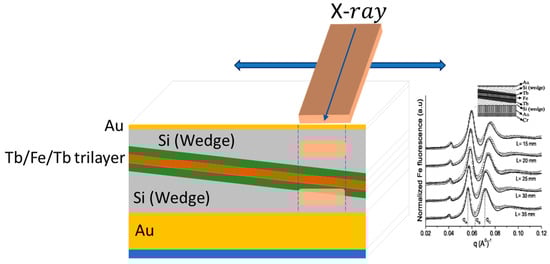 The concept of X-ray standing wave (XSW) technique was first mentioned by B. W. Batterman in the 1960s [206]. It is based on the X-ray interference method where two coherent X-ray beams reflected by the superposed layers of a stratified sample, generating variable electric field intensity fluctuations perpendicular to the reflecting planes [124,207,208], and a periodic electric field is established when the Bragg conditions (Equation (1)) are fulfilled and, like mechanical standing waves, it generates nodes and antinodes. An X-ray standing wave field is two-dimensional, and in the nodal planes, the amplitude of the electric field is suppressed, while in the anti-nodal planes, it is enhanced. The feature of the X-ray standing waves makes them quite suitable for the analysis of periodic layered structures, where the electric field is formed under Bragg conditions. By varying the parameters (wavelength and angle) of the X-ray beams, one may modulate the position of the anti-nodal planes of the electric field to improve the profiling of ultra-shallow depth distributions [78,123]. Combining XSW with XRF or X-ray absorption spectroscopies (Figure 7) can provide depth-selective information about composition (XRF), local atomic structure (XAFS) and magnetic (XMCD) information.