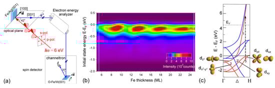 - Donath, M. Spin-Dependent Electronic Structure at Magnetic Surfaces: The Low-Miller-Index Surfaces of Nickel. Surf. Sci. Rep. 1994, 20, 251–316. [Google Scholar] [CrossRef]