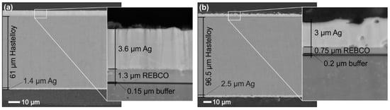 Cross-sections of HTS tapes (a) S-Innovations and (b) SuperPower with measured layer thicknesses.