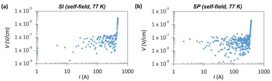 Typical V-I characteristics of the investigated HTS tapes: (a) S-Innovations, (b) SuperPower.