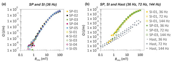 AC losses measured for both S-Innovations and SuperPower HTS tapes in their initial state: (a) measurements on five samples for SP and SI at a single frequency, (b) measurements on a single sample each for SP and SI at three various frequencies. The graph in part (b) is supplemented with AC losses measured in the Hastelloy substrate (Hast).