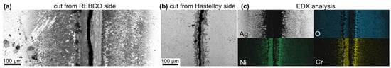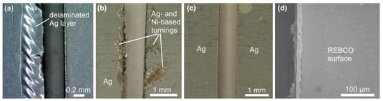 The choice of cutting blade type significantly impacts the quality of the cut edges. Employment of a diamond blade produces voluminous metal turnings at the cut edges, as visible in Figure 4b. According to the EDX analysis, they consist of ductile silver and a Hastelloy alloy. When the HTS tapes are wound helically around a circular former, the tape edges are raised as a consequence of the Poisson effect. This causes indentations in the tapes in the subsequently wound layer of the cable [36]. Tape edges with additional turnings may introduce undesirable damage into the superconducting layer when the tapes are coiled. We encountered similar challenges in our previous work, where relatively small protrusions at the edges of the tape led to the cracking of the superconducting layer of the tape wound in the second layer of the cable.