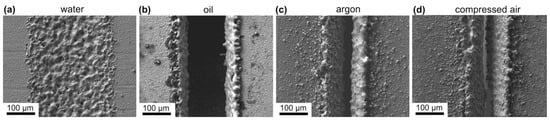 For dividing HTS tapes using laser ablation, we used a laser machine with a fixed pulse duration of 120 ns. Such extended pulses, when combined with maximal power, can locally heat the HTS tape to elevated temperatures. In this scenario, it is possible that the treated area does not have sufficient time to cool down between pulses, potentially having a destructive effect on the superconductor over a broader region [37]. We believe that a device with a shorter pulse duration, in the order of femtoseconds, would be more suitable for this purpose. Extremely short pulse durations are less likely to cause serious damage to the superconductor, even when employing high power, thereby allowing the tape to be divided in a single cutting cycle. Regrettably, due to the fixed long pulse duration of our current laser machine, we were compelled to offset this limitation by employing lower power settings and conducting the laser ablation process multiple times to cut through the entire thickness of the HTS tape. During this process, we applied various cooling media (water, oil, argon, or compressed air) to mitigate the heating effects. Examples of the cuts made under these conditions are shown in Figure 5.