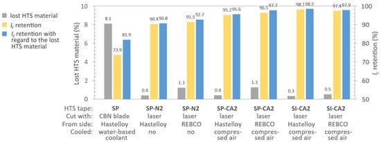 Critical current retention level of both SuperPower and S-Innovations tapes after division of original 12 mm wide tape into three segments, each measuring approximately 4 mm in width. The cutting process involved the utilization of a CBN cutting blade and a laser machine, with cooling and non-cooling options. The positioning of the tapes during cutting varied with respect to the tape’s side. Detail process parameters for laser-cut samples are provided in Table 1.