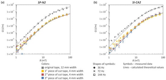 Considering the notably improved Ic retention using laser cutting, we conducted measurement of the AC losses on two such samples, labeled SP-N2 and SI-CA2 in Figure 7. Both samples were cut from the Hastelloy side. The energy release profiles in response to magnetic field variations at three distinct frequencies for these divided tapes are presented in Figure 8. The AC losses of the same tapes in their original state are also included in the plots. The difference between the original and reduced-width tapes is approximately one order of magnitude. However, this comparison overlooks the varying Ic values of the cut tapes, which were approximately 3.15 times lower than the Ic of the original 12 mm wide HTS tape due to division into three pieces. Consequently, the measured AC losses in the narrowed tapes are not actually 10 times lower, as indicated in Figure 8. This discrepancy arises because the drop in Ic in these tapes needs to be taken into account. In the final section, we will revisit these measurements and incorporate them in a comparable plot with normalized values. For magnetic fields where B > 3 mT, the measured data correlate well with the theoretical curves calculated based on the Brandt–Indenbom model, as utilized in the work by Shigemasa et al. [38]. Both graphs representing samples with an 8% difference in Ic retention exhibit striking similarities, indicating that low Ic retention has a minimal influence on AC losses, or it may not by detectable using our measuring system. Nevertheless, our aim remains to obtain HTS tapes with low AC losses while maintaining the highest attainable critical current.