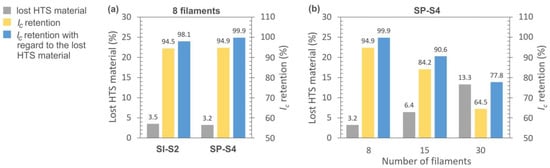 Retention level of critical current in HTS 12 mm wide tapes after laser ablation striation, using compressed air cooling: (a) SuperPower and S-Innovations tapes with eight filaments, (b) SuperPower tapes with an increasing number of filaments. Details of process parameters for the laser striation of the displayed samples are provided in Table 2.