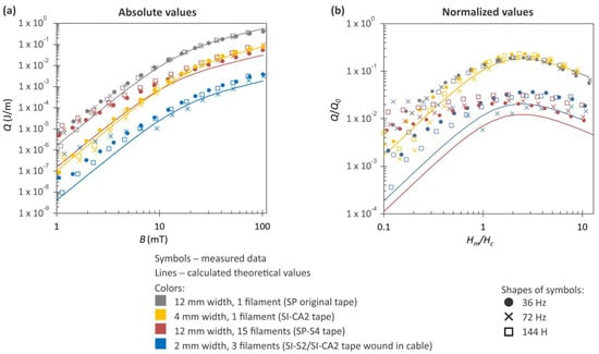 Dependence of AC magnetization losses on magnetic field measured for cut and striated HTS tape wound into a cable. The plots with absolute (a) and normalized values (b) are supplemented by measurements performed on the original SP tape, the HTS tape cut to a 4 mm width, and the HTS tape with 15 filaments. The experimental data, represented by symbols, were obtained at three distinct frequencies. The solid lines represent theoretical values calculated according to the Brandt–Indebom model.
