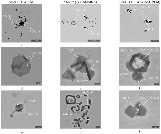 Electron images and types of non-metallic inclusions in experimental ingots: (a,d,g) Steel 1; (b,e,h) Steel 2; (c,f,i) steel 3. Spectrum numbers are shown in parentheses (from Table 3).