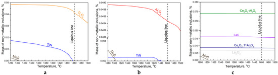 In Steel 3, deoxidized with titanium, then aluminum, and then modified with cerium and lanthanum, almost all inclusions are primary (Figure 4c). At a temperature of 1500 °C, complex oxides of cerium and lanthanum (Ce2O3·Al2O3 and Ce2O3·11Al2O3), lanthanum oxides (La2O3) and lanthanum sulfides (LaS) are formed. As the temperature decreases, the amount of lanthanum sulfide increases slightly. Clusters are not found in this steel because titanium and aluminum are completely reduced by rare earth metals from oxides and nitrides. Titanium nitrides were found along the boundaries of the inclusions, apparently forming below the solidus temperature. Note that, as in the case of Steel 2, even after REM treatment, untransformed inclusions can be found in the ingot, partially preserved until the complete solidification of Steel 3. In Figure 2f, the found nonequilibrium inclusion of corundum is shown.