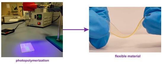 Photopolymerization is one of the frequently used methods for the manufacturing of polymeric materials, including thin films utilized in the coating and adhesive industries, as well as in advanced high-tech applications [1,2]. UV curing is a highly advantageous method due to its low energy consumption, rapid curing time (often in seconds), and low reaction temperature. When non-toxic and “green” monomers/precursors are utilized in photopolymerization, the whole process becomes sustainable and environmentally friendly.