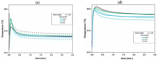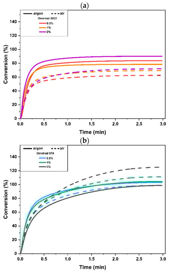 Materials cured with Omnirad 2022 showed higher Cmax with increasing concentrations of the photoinitiator, i.e., 1 and 2 mol%, and these changes were independent of the curing atmosphere. In the case of Omnirad 819 (Figure 3b), a similar trend is observed only for materials cured in an air atmosphere (the higher the concentration of the photoinitiator, the higher the conversion).