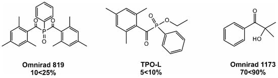 The observed differences can be explained by the chemical structure of photoinitiators. Both photoinitiators are type I photoinitiators. This means that the radicals are formed by homolytic decay of the excited state of the initiator excited by the light. Omnirad 819 is a trade name for bis(2,4,6-trimethylbenzoyl)-phenylphosphine oxide, while Omnirad 2022 is a blend that includes Omnirad 819 (up to 25%) and two other photoinitiators: TPO-L [ethyl phenyl(2,4,6-trimethylbenzoyl)phosphinate] and Omnirad 1173 (2-hydroxy-2-methyl-1-phenylpropanone). Their chemical structures are shown in Figure 5.