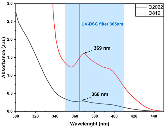 The used photoinitiators absorb the light in the wavelength range of 360–420 nm. The maximum adsorption of Omnirad 819 in acetonitrile, as reported by the manufacturer, is found at 380 nm, whereas our measurements indicated a maximum absorbance at 369 nm (Figure 6). The Omnirad 2022’s adsorption maximum, according to the manufacturer, is 370 nm, whereas the experimental results indicated the maximum to be 368 nm (Figure 6).