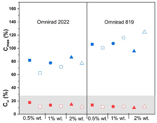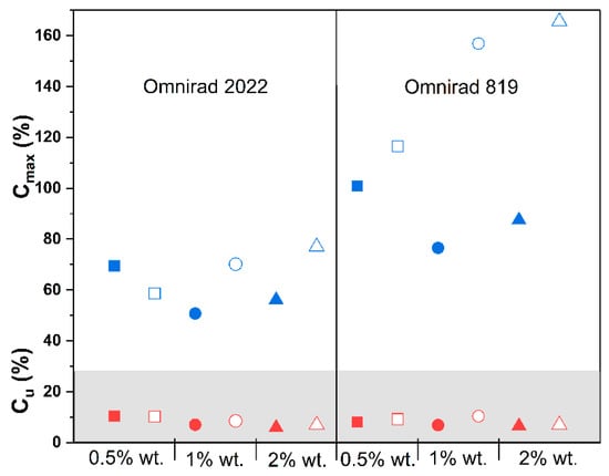 Influence of photopolymerization conditions on the conversion value at the highest reaction rate (Cu, in gray, red symbols) and maximum conversion (Cmax, blue symbols) for reactions in argon (closed symbols) and air atmospheres (open symbols) at 50 mW/cm2. Square—0.5% wt.; bullet—1% wt.; triangle—2% wt.